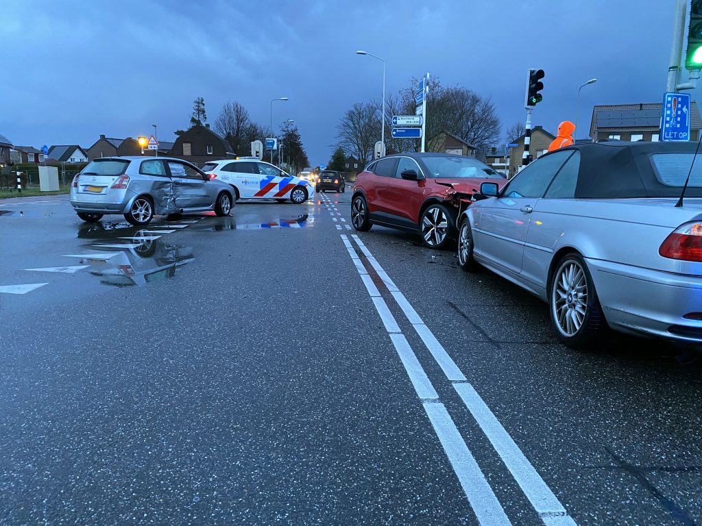 Swalmen – Donderdag is net na het invallen van de avond een ongeval gebeurd op de Rijksweg Noord ter hoogte van de Holleweg/Molenweg. Een van de auto’s wilde afslaan bij de verkeerslichten, en zag daarbij een tegenligger over het hoofd. De afslaande auto werd door de tegenligger in de flank geraakt die daarna frontaal tegen een achterligger van de afslaande auto botste. Alle voertuigen raakte daardoor zwaar, zo niet, totalloss door de aanrijding.