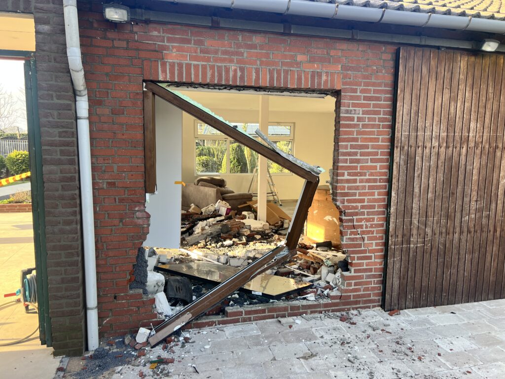 De schade aan de garage en auto is aanzienlijk, een berger heeft het voertuig meegenomen. De nieuwe bewoners van het adres hebben afgelopen maanden flink verbouwd. Het stucwerk van de tot woonkamer omgebouwde garage is net opgedroogd.