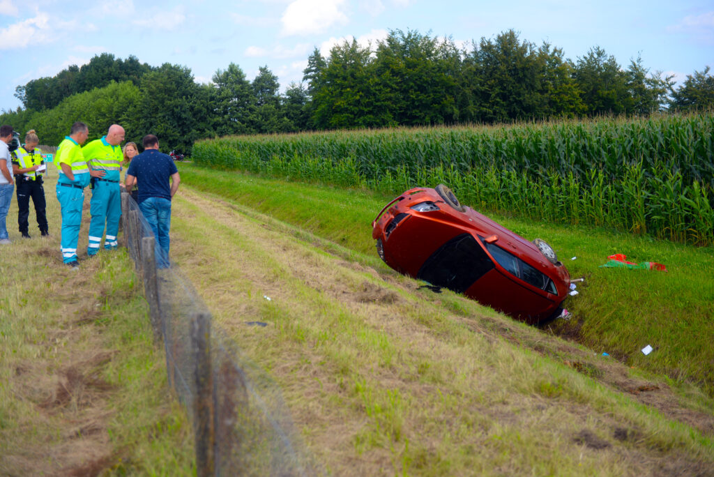 Een automobilist is zaterdagmiddag ondersteboven in een beek beland nadat hij meerdere malen over de kop is gevlogen. Volgens een getuige die achter de auto reed ging die ‘zeker 10 keer over de kop’ aldus de getuige. Door nog onbekende oorzaak reed de automobilist vlak in noordelijke rijrichting voor een bocht rechtdoor. De bestuurder kon uiteindelijk zelf uit zijn auto klimmen, omdat hij meerdere malen over de kop gevlogen was, werd hij voor controle mee genomen naar het ziekenhuis om te controleren of er inwendige verwondingen zijn.